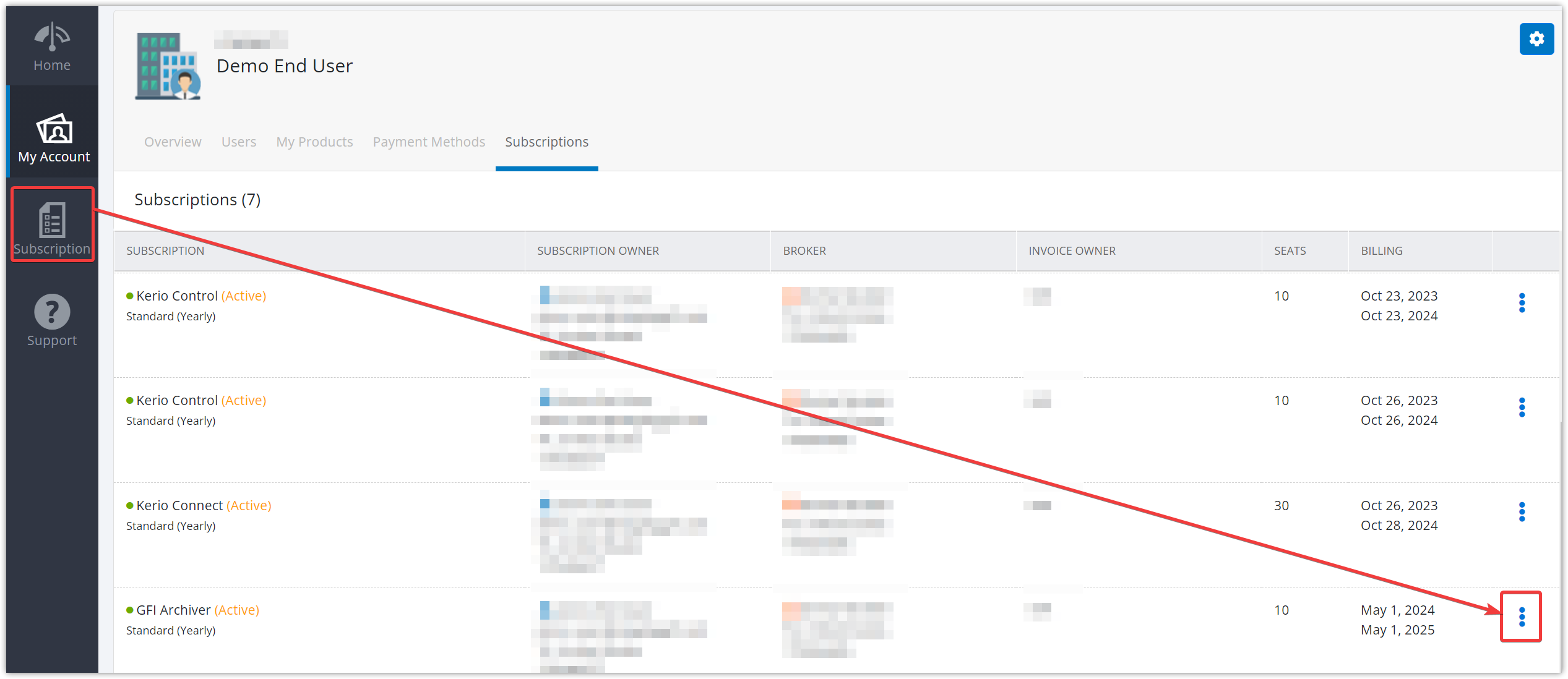 - On the side menu, click Subscription to load the list of your GFI subscriptions