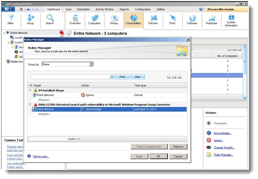 From the GFI LanGuard console, one can set up rules to Acknowledge or Ignore vulnerabilities and patches. Once these rules have been set up, these patches would not be listed as missing in future scans. This is particularly useful for applications like Internet Explorer, .NET Framework, etc.
