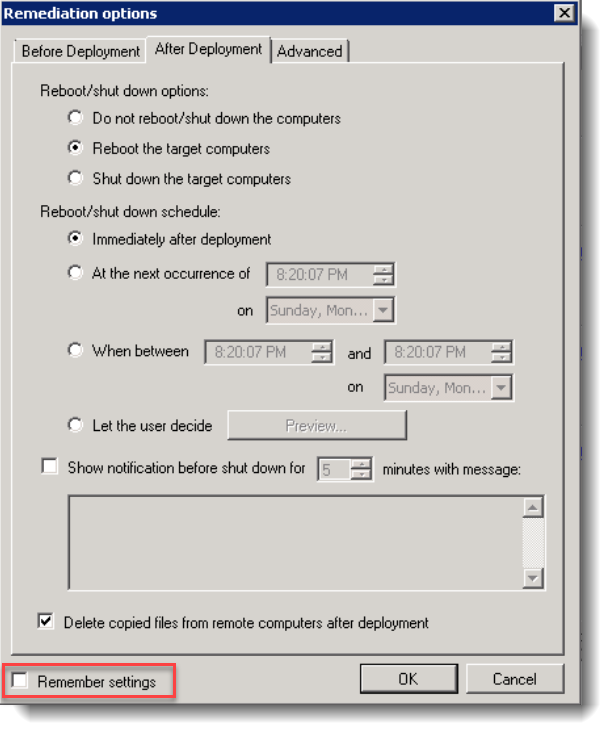 For example, if remediating to 500 machines each with 20 patches, the remediation job could easily take many hours. If it continues the next day, this could result in computers rebooting during the day when users are working. In this case, we recommend you restrict the reboot times from the Advanced options.