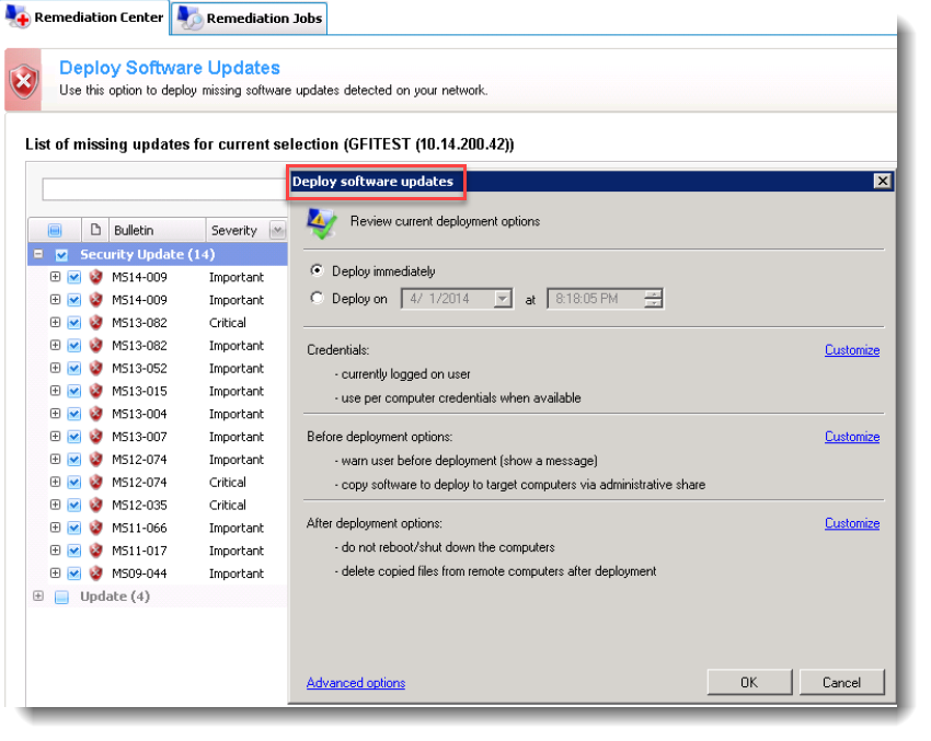 IMPORTANT: If you are doing remediation to a large number of machines keep in mind that GFI LanGuard can only deploy to a fixed number of computers at the same time. This number is the number of threads you have configured in the Advanced options.