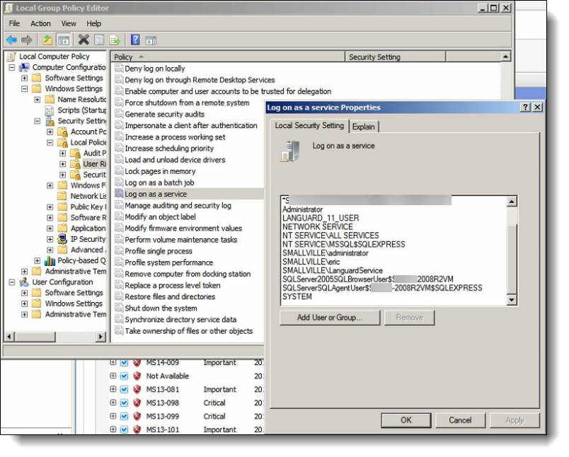 - Find the Log on as a service policy and add the appropriate user or group.