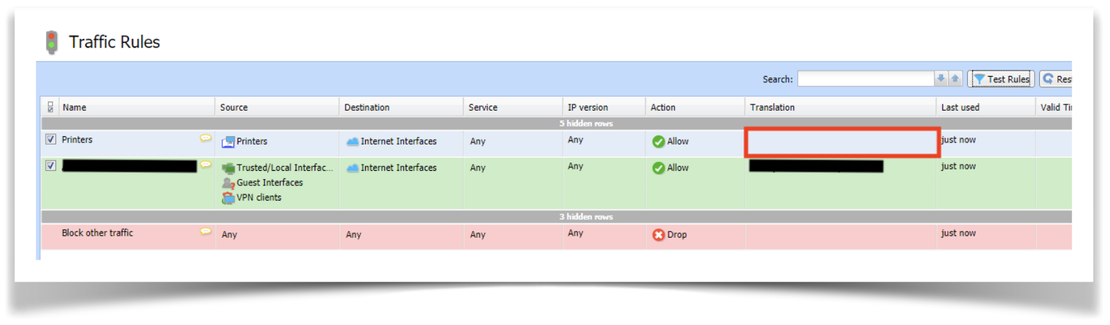 If the traffic rule for printers is already added and the feature is still not working, the traffic rule may be missing the NAT configuration, as shown below: